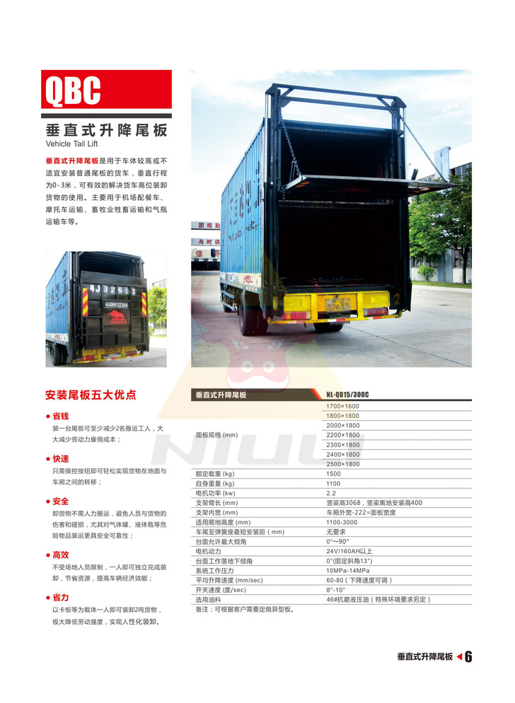垂直式升降尾板是用于車體較高或不適宜安裝普通尾板的貨車,垂直行程為0-3米,可有效地解決貨車高位裝卸貨物的使用。主要用于集成配餐車、摩托車運輸、畜牧業(yè)牲畜運輸和氣瓶運輸車等。