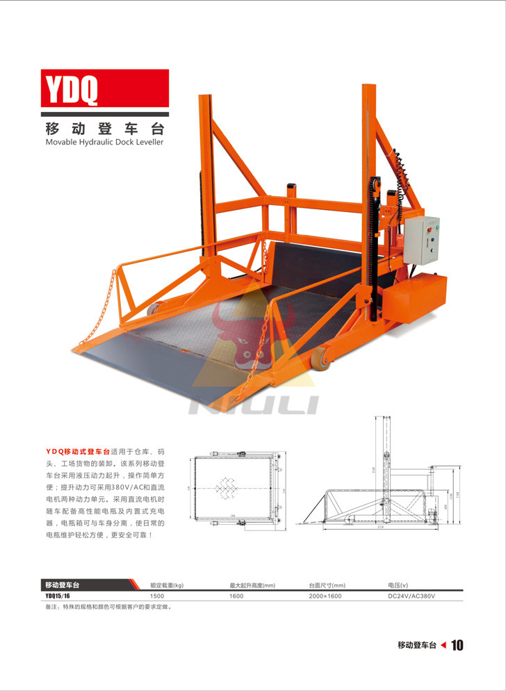 YDQ移動(dòng)式登車臺(tái)適用于倉(cāng)庫(kù)、碼頭、工場(chǎng)貨物的裝卸。該系列移動(dòng)登車臺(tái)采用液壓動(dòng)力起升,操作簡(jiǎn)單方便;提升動(dòng)力可采用380V/AC和直流電機(jī)兩種動(dòng)力單元。采用直流電機(jī)時(shí)隨車配備高性能電瓶及內(nèi)置式充電器。