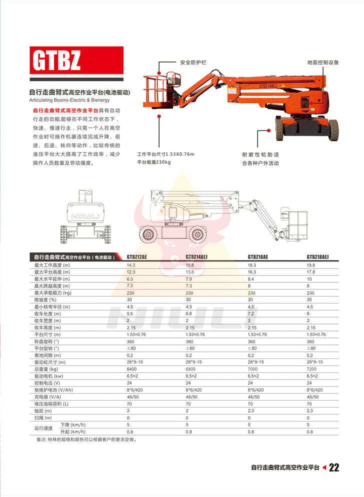 曲臂式高空作業(yè)平臺具有伸縮臂,能懸伸作業(yè),跨越一定的障礙或在一處升降可進行多點作業(yè);升降平臺移動性好,轉移場地方便;外觀美觀,適于室內外作業(yè)和存放。