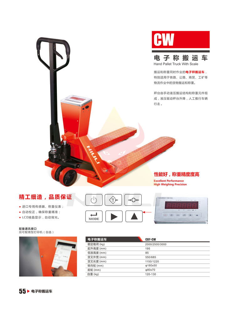 搬運和稱重同時作業(yè)的電子秤搬運車,特別適用于鐵路、公路、商貿(mào)、工礦作業(yè)中的貨物搬運和稱重。秤臺由手動液壓搬運結(jié)構(gòu)和稱重原件組成,液壓驅(qū)動秤臺升降,人工推行車輛行走。